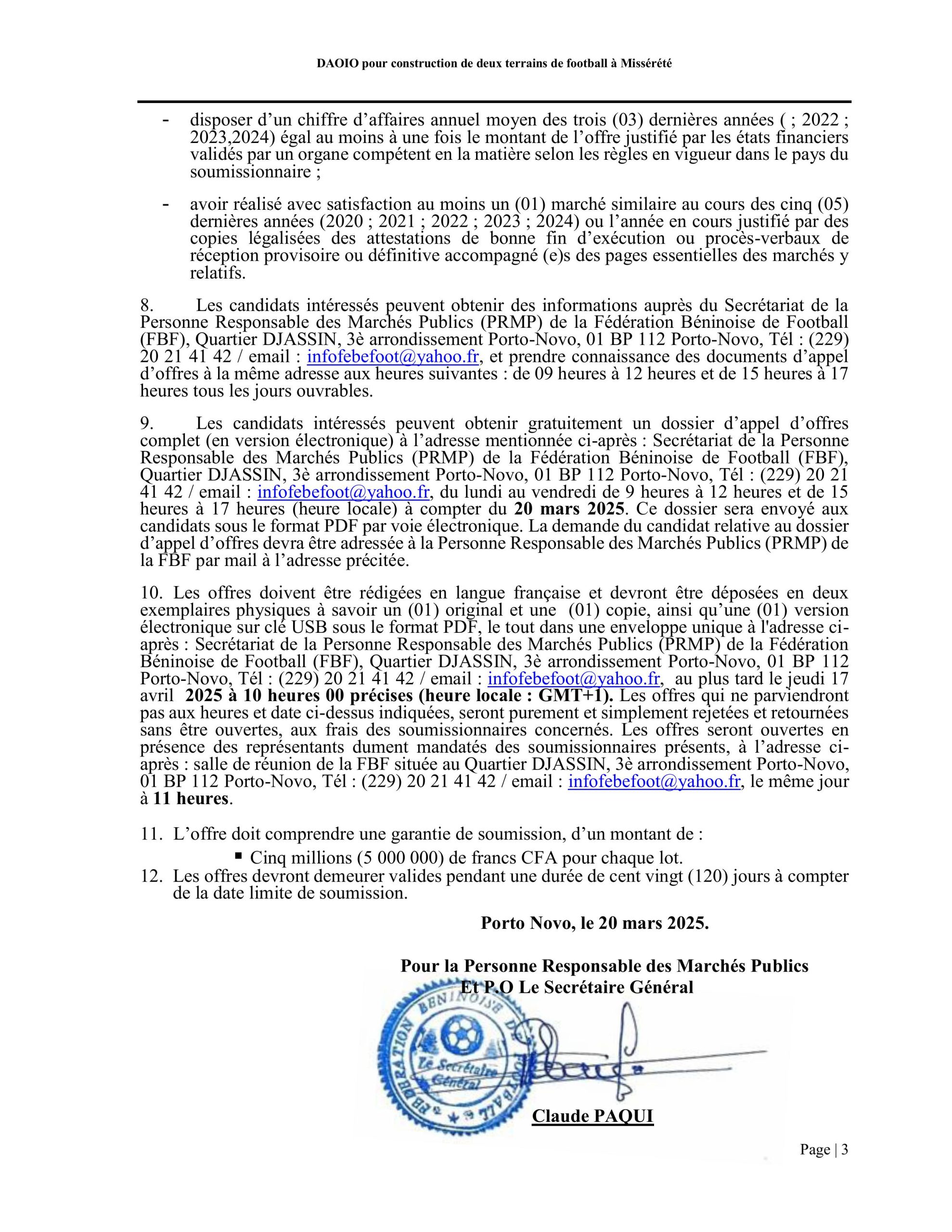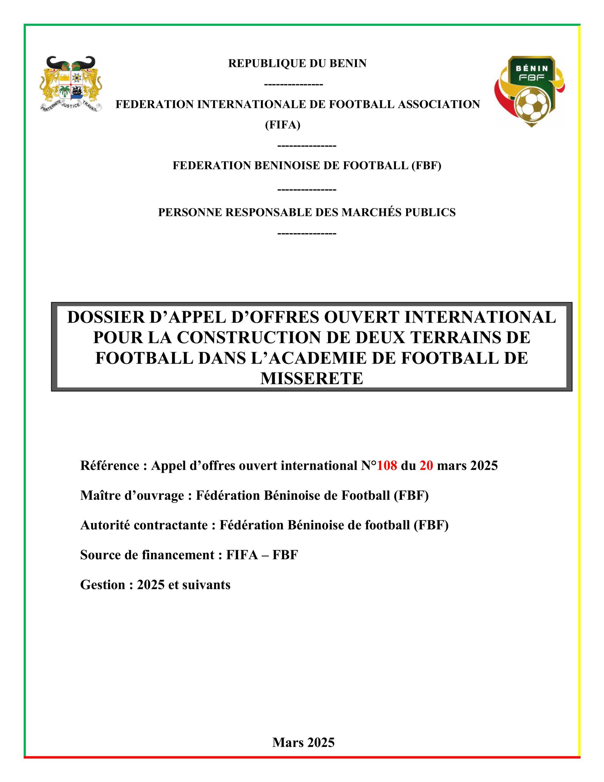 Autorité contractante : Fédération Béninoise de Football (FBF)