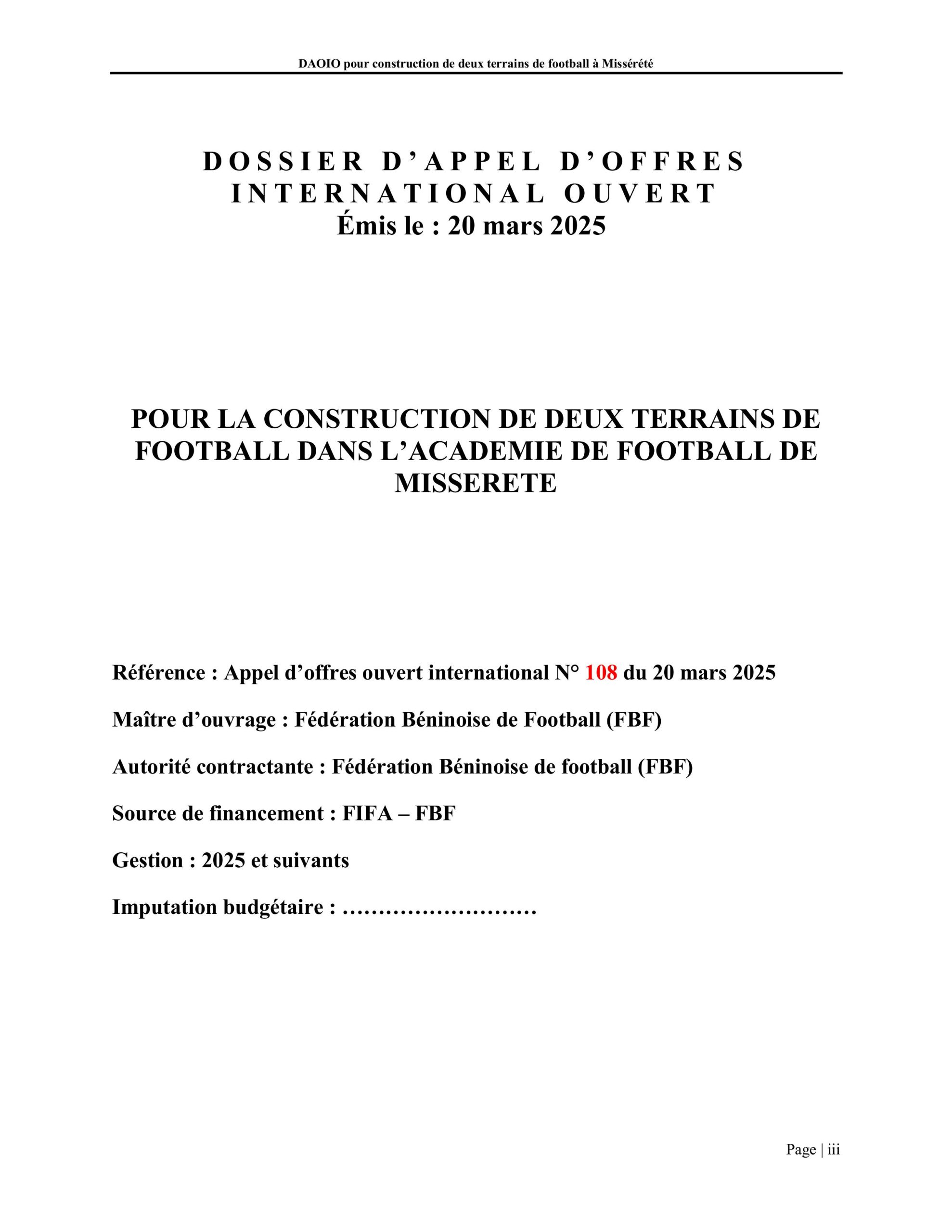Avis d’Appel d’Offres Ouvert International pour la construction de deux terrains de football dans l’Académie de Football de Missérété