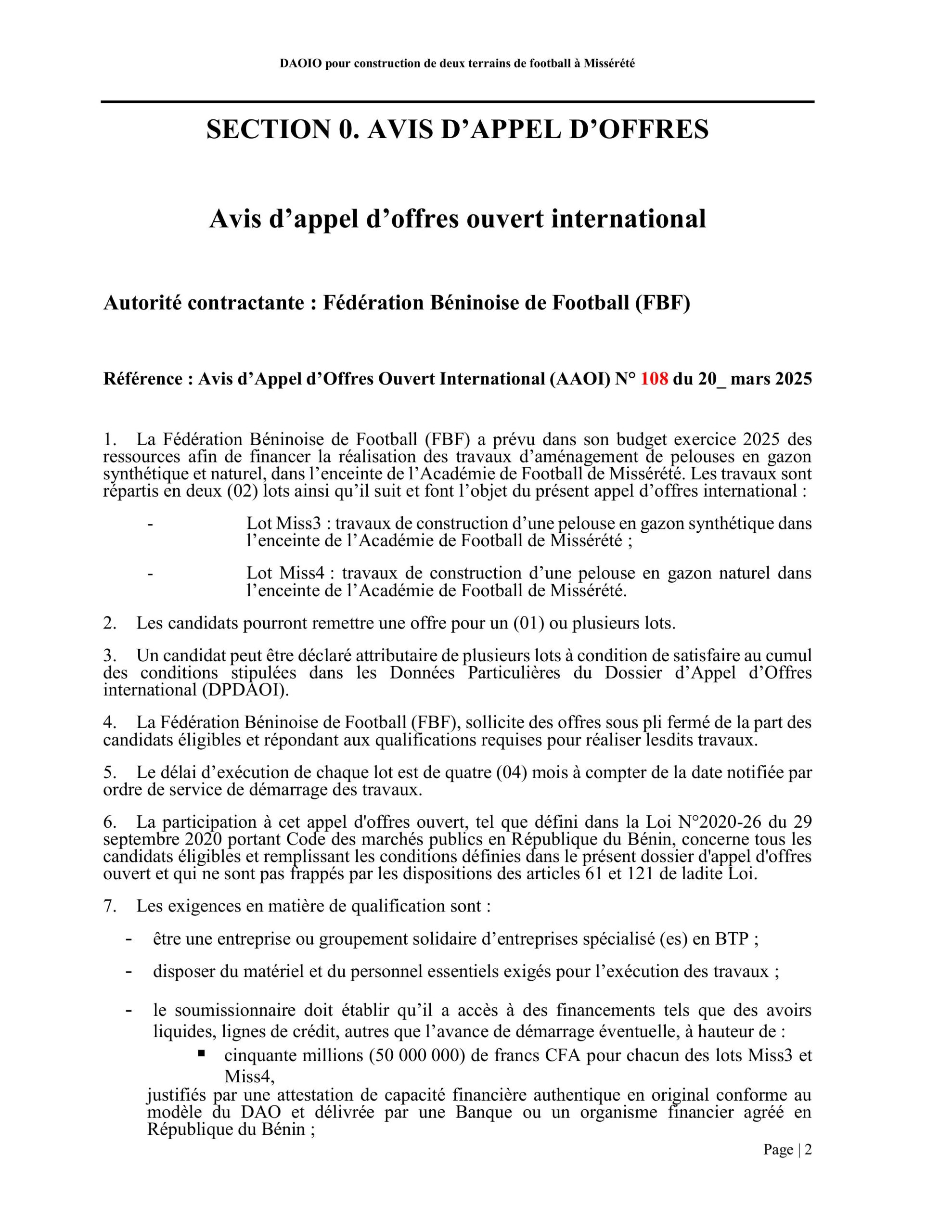 Référence : Appel d’Offres Ouvert International N°108 du 20 mars 2025