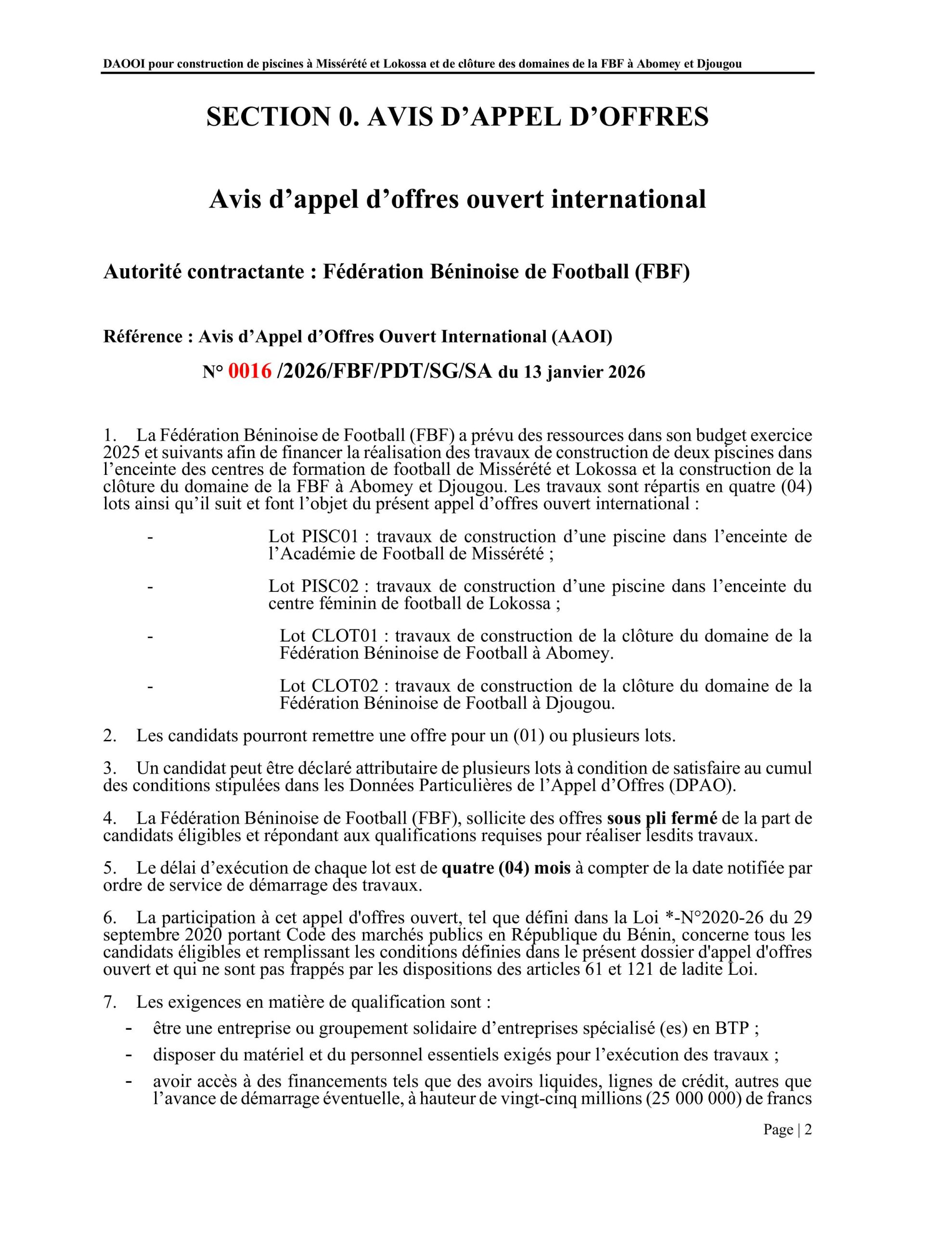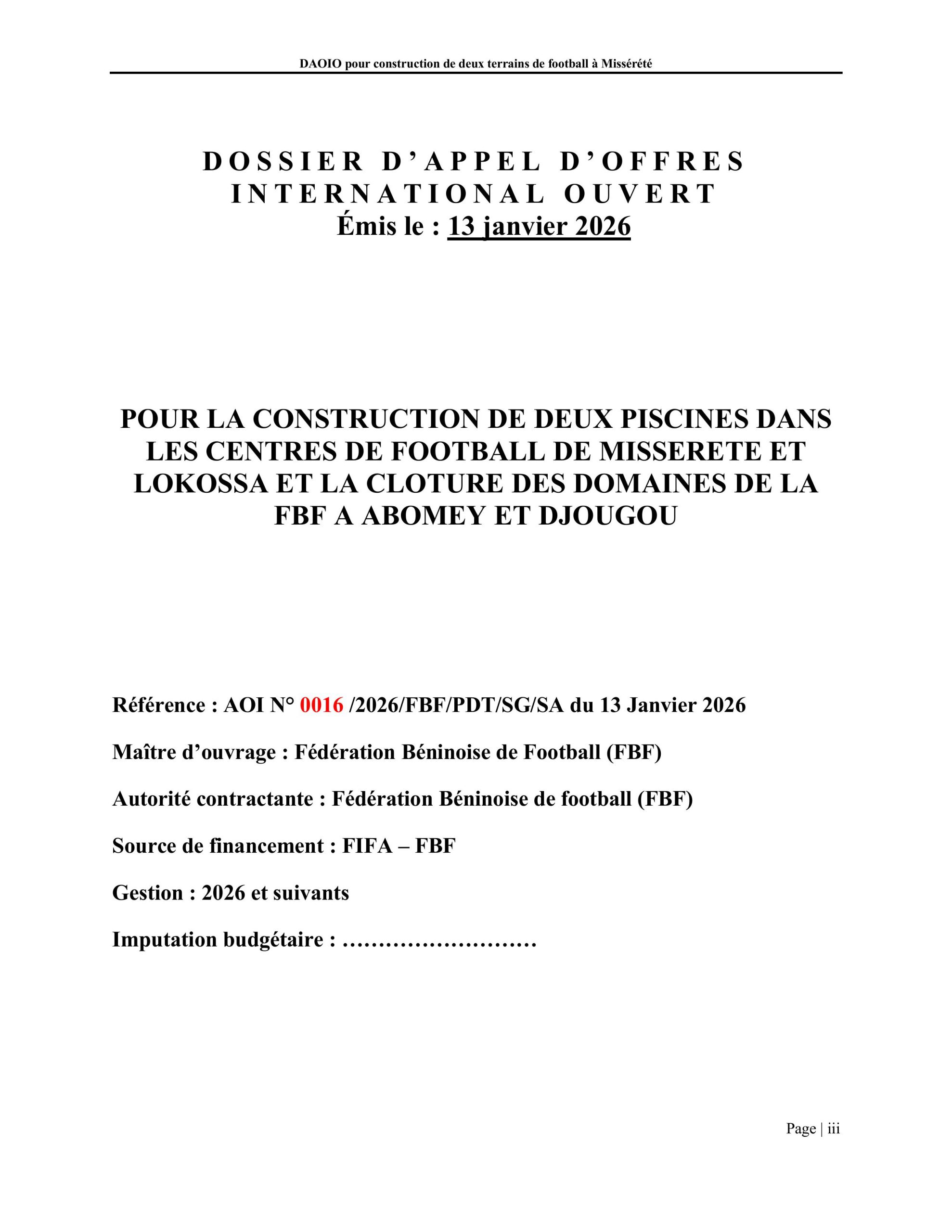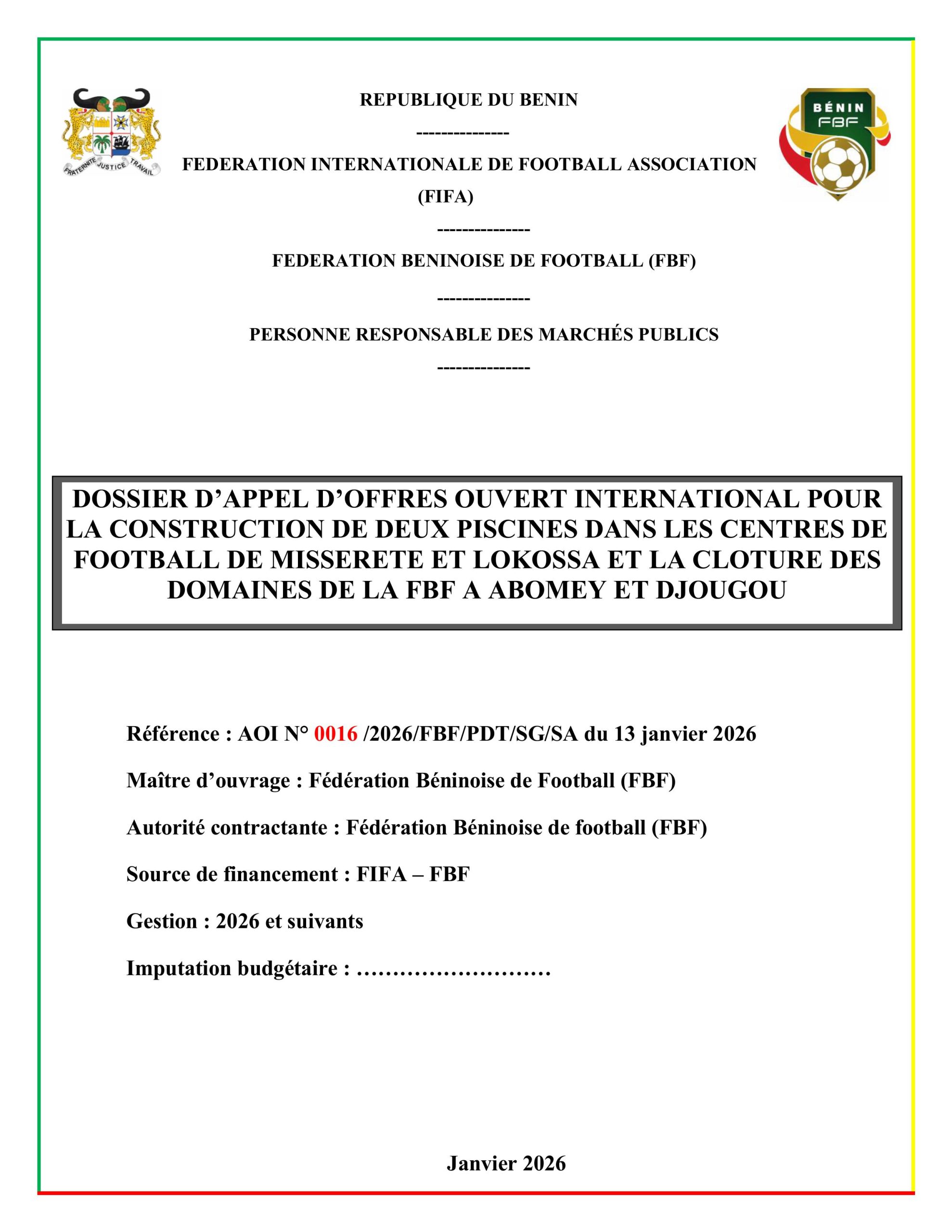 La Fédération Béninoise de Football (FBF) a lancé un appel d’offres ouvert international pour la construction de deux piscines dans les centres de football de Missérété et de Lokossa, ainsi que pour la clôture des domaines de la FBF à Abomey et Djougou. Cet appel d’offres, référencé AOI N° 0016/2026/FBF/PDT/SG/SA est disponible ci dessous. La version pdf est disponible ici