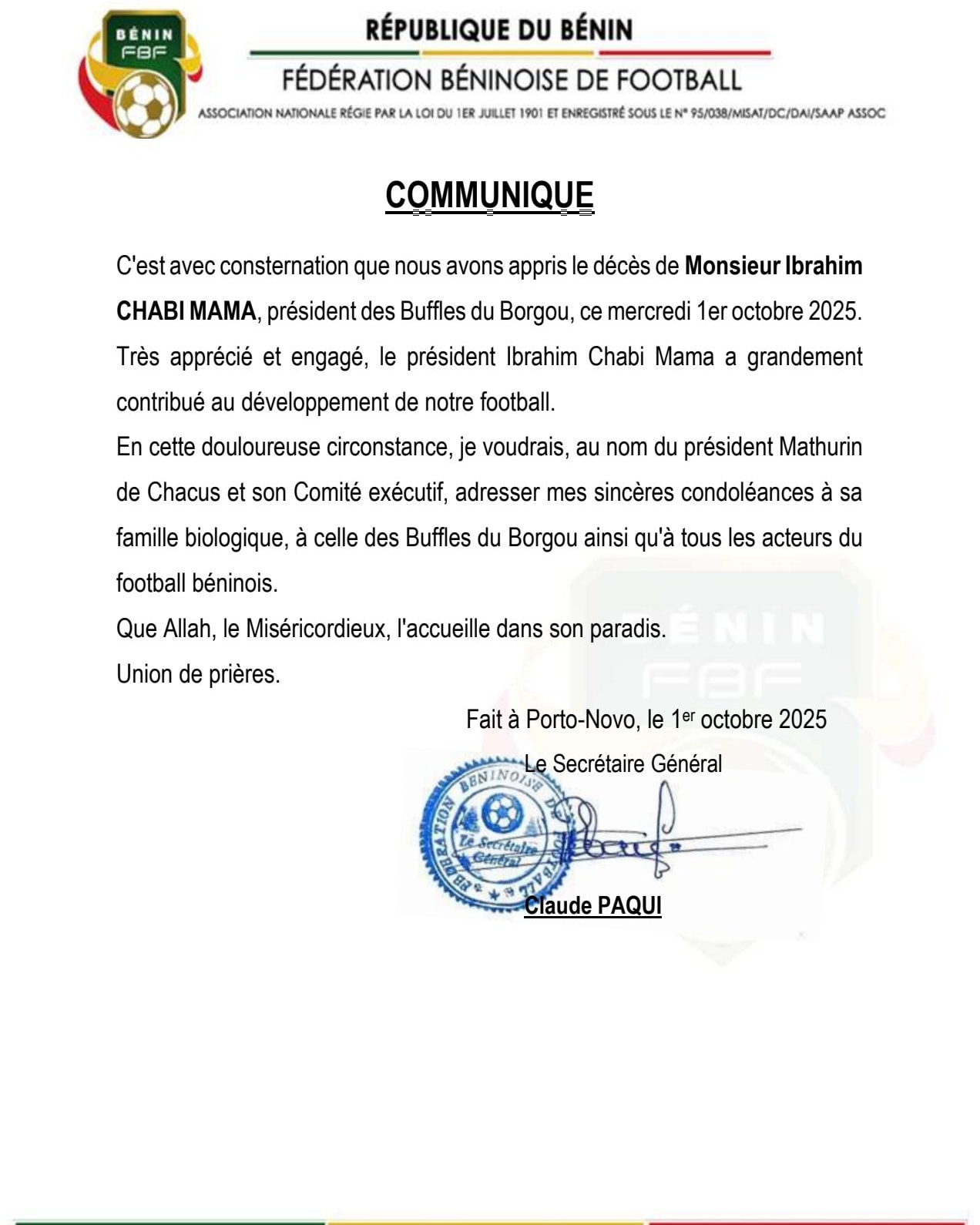 La grande famille du football béninois est en deuil. Le président des Buffles du Borgou, M. Ibrahim Chabi Mama, nous a quittés ce mercredi 1ᵉʳ octobre 2025. Nos pensées vont à sa famille, à son club, les Buffles du Borgou, ainsi qu’à l’ensemble des acteurs du football béninois.